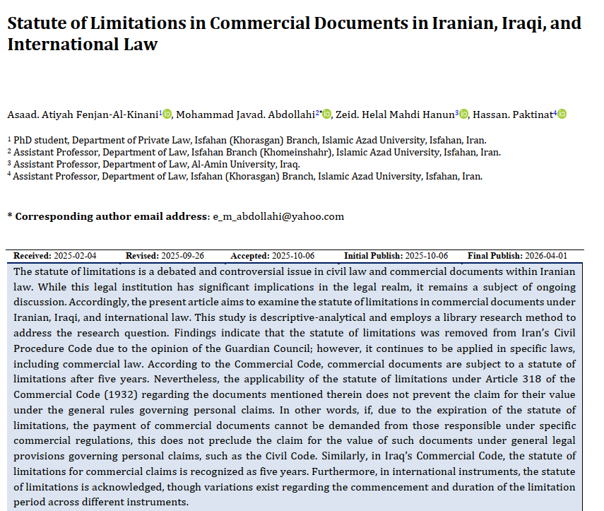 The statute of limitations is a debated and controversial issue in civil law and commercial documents within Iranian law. While this legal institution has significant implications in the legal realm, it remains a subject of ongoing discussion. Accordingly, the present article aims to examine the statute of limitations in commercial documents under Iranian, Iraqi, and international law. This study is descriptive-analytical and employs a library research method to address the research question. Findings indicate that the statute of limitations was removed from Iran’s Civil Procedure Code due to the opinion of the Guardian Council; however, it continues to be applied in specific laws, including commercial law. According to the Commercial Code, commercial documents are subject to a statute of limitations after five years. Nevertheless, the applicability of the statute of limitations under Article 318 of the Commercial Code (1932) regarding the documents mentioned therein does not prevent the claim for their value under the general rules governing personal claims. In other words, if, due to the expiration of the statute of limitations, the payment of commercial documents cannot be demanded from those responsible under specific commercial regulations, this does not preclude the claim for the value of such documents under general legal provisions governing personal claims, such as the Civil Code. Similarly, in Iraq’s Commercial Code, the statute of limitations for commercial claims is recognized as five years. Furthermore, in international instruments, the statute of limitations is acknowledged, though variations exist regarding the commencement and duration of the limitation period across different instruments.