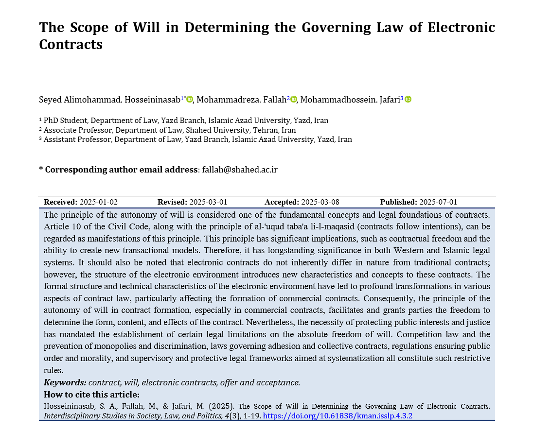 The principle of the autonomy of will is considered one of the fundamental concepts and legal foundations of contracts. Article 10 of the Civil Code, along with the principle of al-'uqud taba'a li-l-maqasid (contracts follow intentions), can be regarded as manifestations of this principle. This principle has significant implications, such as contractual freedom and the ability to create new transactional models. Therefore, it has longstanding significance in both Western and Islamic legal systems. It should also be noted that electronic contracts do not inherently differ in nature from traditional contracts; however, the structure of the electronic environment introduces new characteristics and concepts to these contracts. The formal structure and technical characteristics of the electronic environment have led to profound transformations in various aspects of contract law, particularly affecting the formation of commercial contracts. Consequently, the principle of the autonomy of will in contract formation, especially in commercial contracts, facilitates and grants parties the freedom to determine the form, content, and effects of the contract. Nevertheless, the necessity of protecting public interests and justice has mandated the establishment of certain legal limitations on the absolute freedom of will. Competition law and the prevention of monopolies and discrimination, laws governing adhesion and collective contracts, regulations ensuring public order and morality, and supervisory and protective legal frameworks aimed at systematization all constitute such restrictive rules.