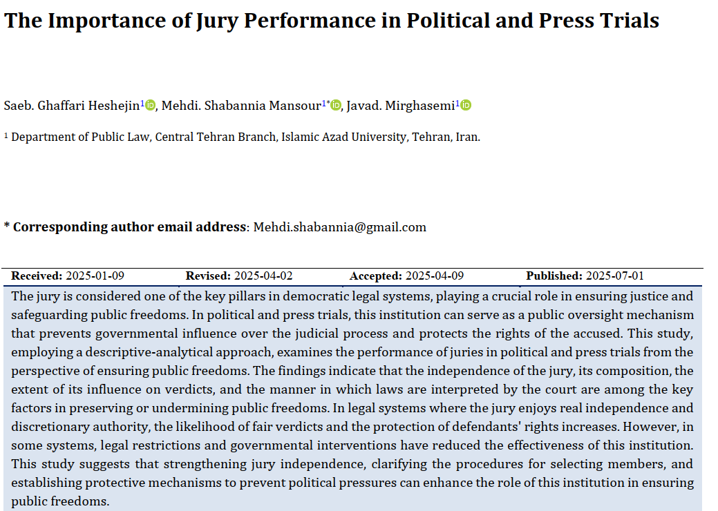 The jury is considered one of the key pillars in democratic legal systems, playing a crucial role in ensuring justice and safeguarding public freedoms. In political and press trials, this institution can serve as a public oversight mechanism that prevents governmental influence over the judicial process and protects the rights of the accused. This study, employing a descriptive-analytical approach, examines the performance of juries in political and press trials from the perspective of ensuring public freedoms. The findings indicate that the independence of the jury, its composition, the extent of its influence on verdicts, and the manner in which laws are interpreted by the court are among the key factors in preserving or undermining public freedoms. In legal systems where the jury enjoys real independence and discretionary authority, the likelihood of fair verdicts and the protection of defendants' rights increases. However, in some systems, legal restrictions and governmental interventions have reduced the effectiveness of this institution. This study suggests that strengthening jury independence, clarifying the procedures for selecting members, and establishing protective mechanisms to prevent political pressures can enhance the role of this institution in ensuring public freedoms.