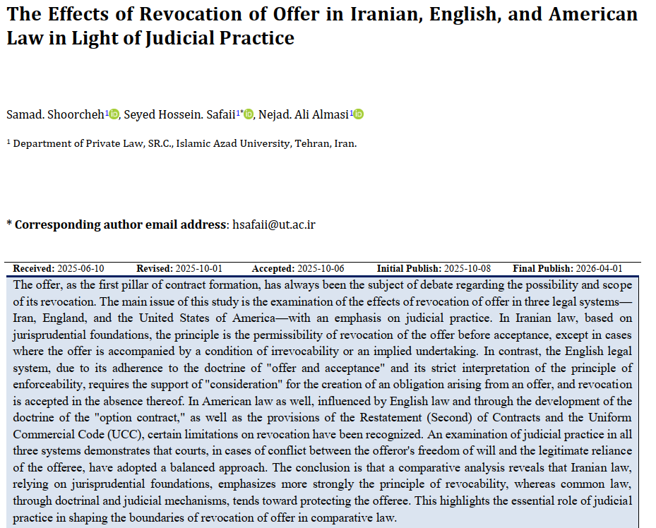 The offer, as the first pillar of contract formation, has always been the subject of debate regarding the possibility and scope of its revocation. The main issue of this study is the examination of the effects of revocation of offer in three legal systems—Iran, England, and the United States of America—with an emphasis on judicial practice. In Iranian law, based on jurisprudential foundations, the principle is the permissibility of revocation of the offer before acceptance, except in cases where the offer is accompanied by a condition of irrevocability or an implied undertaking. In contrast, the English legal system, due to its adherence to the doctrine of "offer and acceptance" and its strict interpretation of the principle of enforceability, requires the support of "consideration" for the creation of an obligation arising from an offer, and revocation is accepted in the absence thereof. In American law as well, influenced by English law and through the development of the doctrine of the "option contract," as well as the provisions of the Restatement (Second) of Contracts and the Uniform Commercial Code (UCC), certain limitations on revocation have been recognized. An examination of judicial practice in all three systems demonstrates that courts, in cases of conflict between the offeror's freedom of will and the legitimate reliance of the offeree, have adopted a balanced approach. The conclusion is that a comparative analysis reveals that Iranian law, relying on jurisprudential foundations, emphasizes more strongly the principle of revocability, whereas common law, through doctrinal and judicial mechanisms, tends toward protecting the offeree. This highlights the essential role of judicial practice in shaping the boundaries of revocation of offer in comparative law.