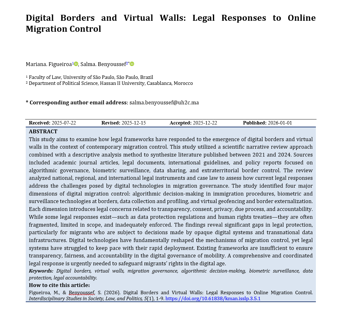 Digital borders, virtual walls, migration governance, algorithmic decision-making, biometric surveillance, data protection, legal accountabilityAbstract