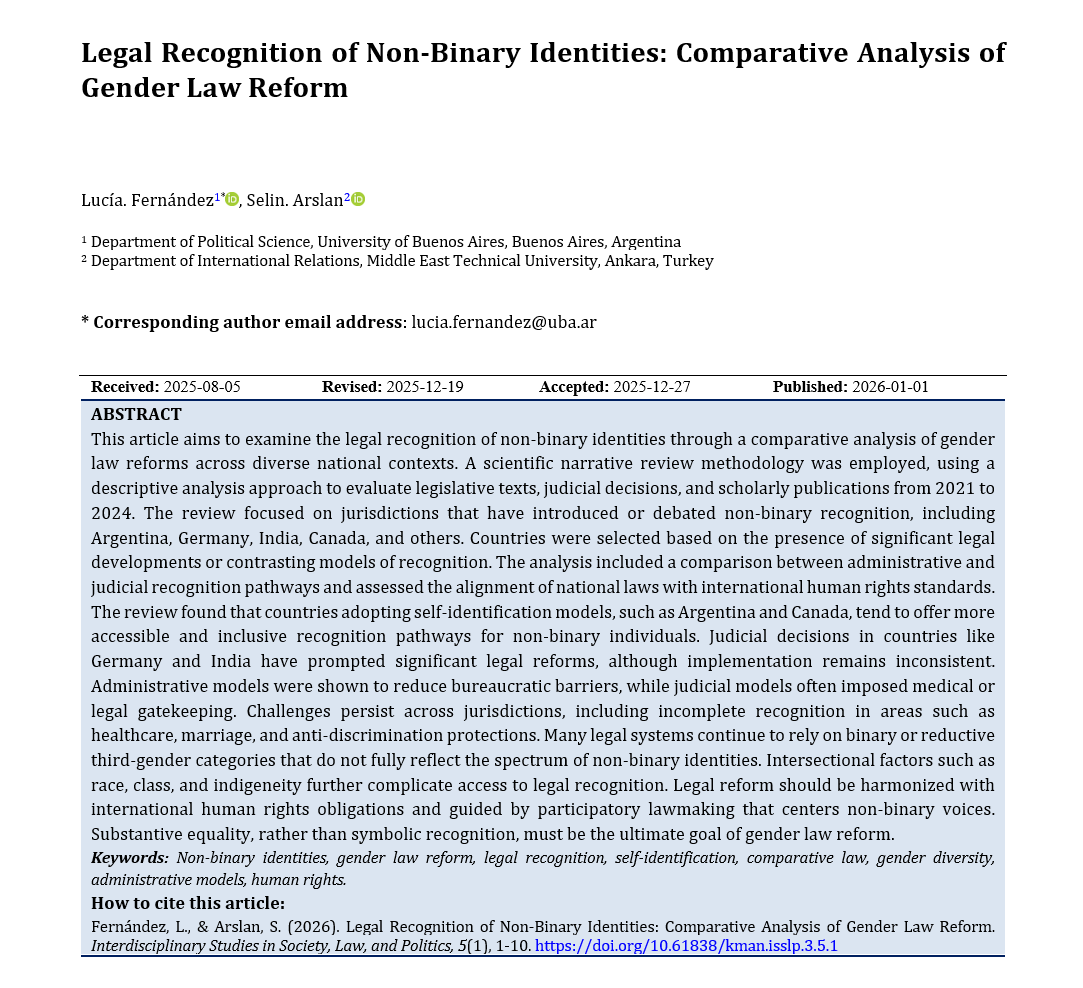 Fernández, L., & Arslan, S. (2026). Legal Recognition of Non-Binary Identities: Comparative Analysis of Gender Law Reform. Interdisciplinary Studies in Society, Law, and Politics, 5(1), 1-10. https://www.journalisslp.com/index.php/isslp/article/view/462