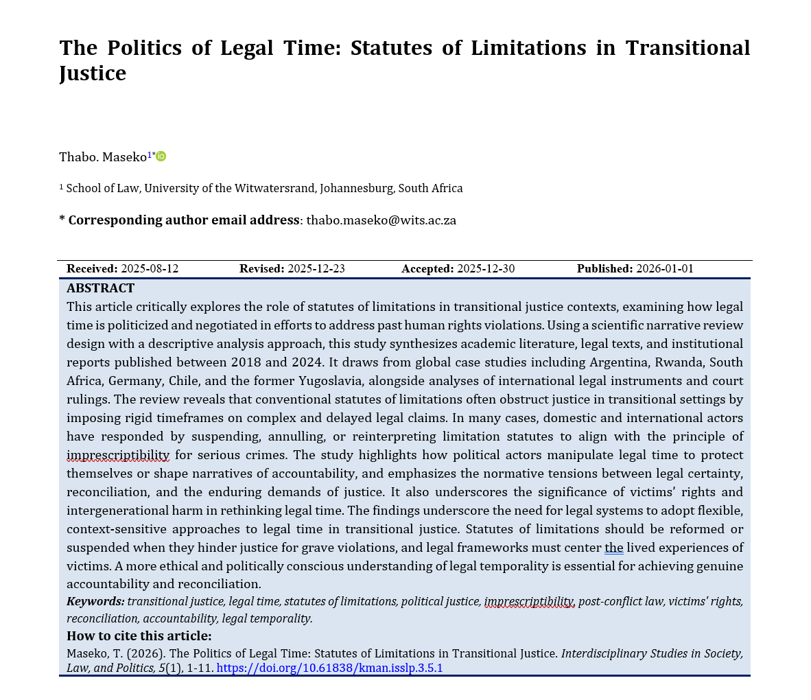Maseko, T. (2026). The Politics of Legal Time: Statutes of Limitations in Transitional Justice. Interdisciplinary Studies in Society, Law, and Politics, 5(1), 1-11. https://journalisslp.com/index.php/isslp/article/view/464