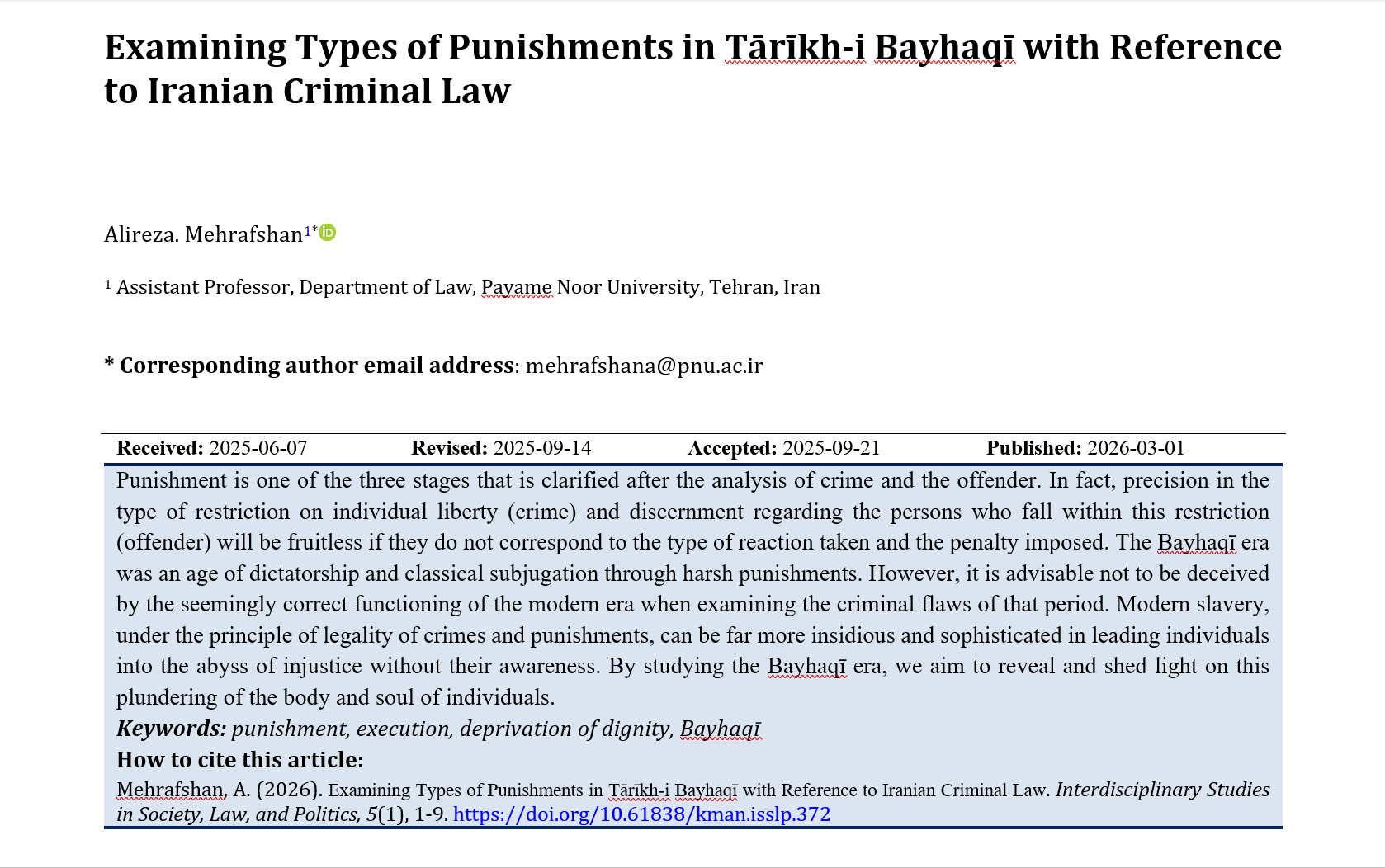 Mehrafshan, A. (2026). Examining Types of Punishments in Tārīkh-i Bayhaqī with Reference to Iranian Criminal Law. Interdisciplinary Studies in Society, Law, and Politics, 1-9. https://www.journalisslp.com/index.php/isslp/article/view/372