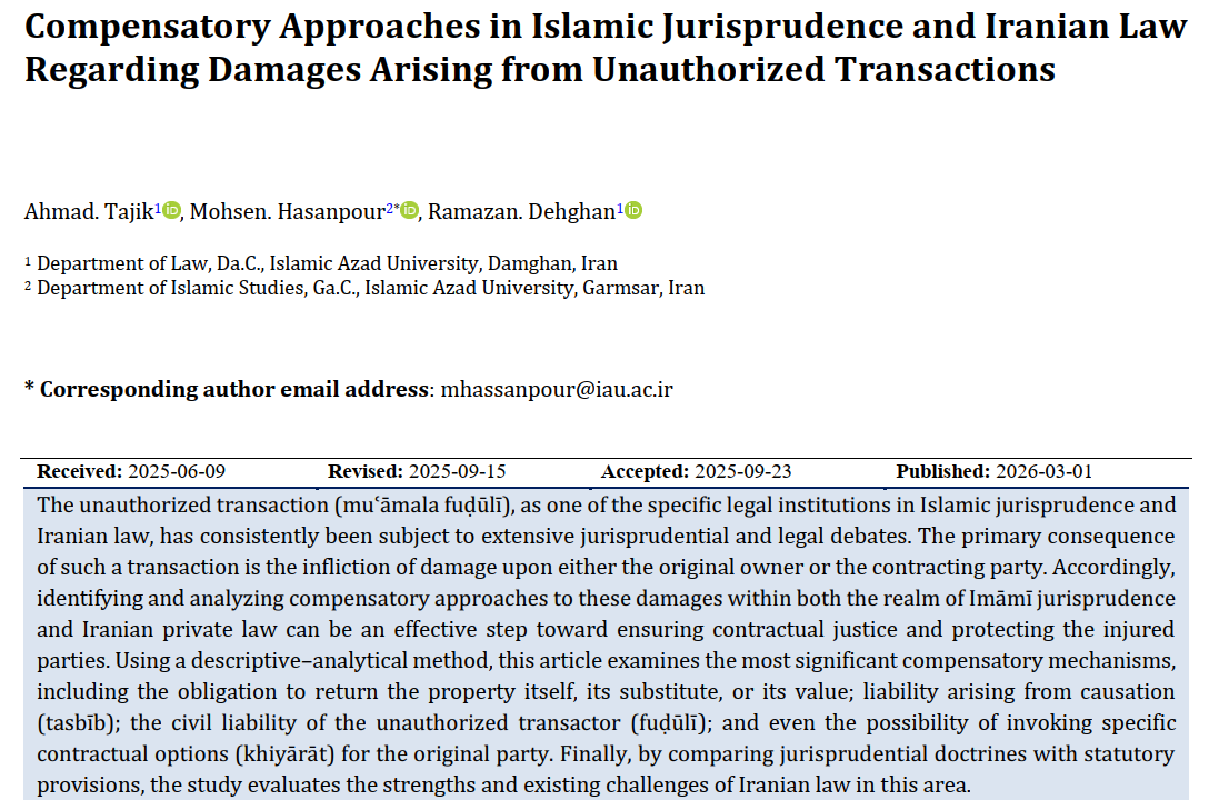 The unauthorized transaction (muʿāmala fuḍūlī), as one of the specific legal institutions in Islamic jurisprudence and Iranian law, has consistently been subject to extensive jurisprudential and legal debates. The primary consequence of such a transaction is the infliction of damage upon either the original owner or the contracting party. Accordingly, identifying and analyzing compensatory approaches to these damages within both the realm of Imāmī jurisprudence and Iranian private law can be an effective step toward ensuring contractual justice and protecting the injured parties. Using a descriptive–analytical method, this article examines the most significant compensatory mechanisms, including the obligation to return the property itself, its substitute, or its value; liability arising from causation (tasbīb); the civil liability of the unauthorized transactor (fuḍūlī); and even the possibility of invoking specific contractual options (khiyārāt) for the original party. Finally, by comparing jurisprudential doctrines with statutory provisions, the study evaluates the strengths and existing challenges of Iranian law in this area.
