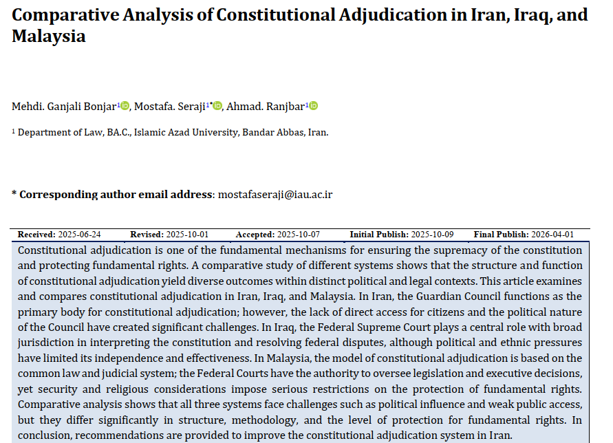 Constitutional adjudication is one of the fundamental mechanisms for ensuring the supremacy of the constitution and protecting fundamental rights. A comparative study of different systems shows that the structure and function of constitutional adjudication yield diverse outcomes within distinct political and legal contexts. This article examines and compares constitutional adjudication in Iran, Iraq, and Malaysia. In Iran, the Guardian Council functions as the primary body for constitutional adjudication; however, the lack of direct access for citizens and the political nature of the Council have created significant challenges. In Iraq, the Federal Supreme Court plays a central role with broad jurisdiction in interpreting the constitution and resolving federal disputes, although political and ethnic pressures have limited its independence and effectiveness. In Malaysia, the model of constitutional adjudication is based on the common law and judicial system; the Federal Courts have the authority to oversee legislation and executive decisions, yet security and religious considerations impose serious restrictions on the protection of fundamental rights. Comparative analysis shows that all three systems face challenges such as political influence and weak public access, but they differ significantly in structure, methodology, and the level of protection for fundamental rights. In conclusion, recommendations are provided to improve the constitutional adjudication system in Iran.