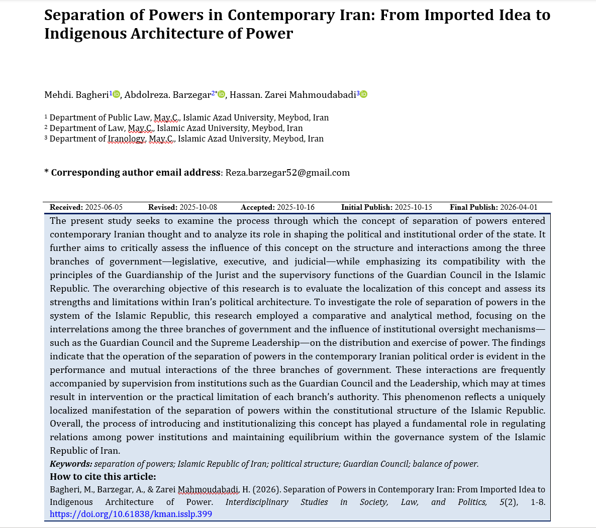 Bagheri, M. ., Barzegar, A., & Zarei Mahmoudabadi, H. . (2026). Separation of Powers in Contemporary Iran: From Imported Idea to Indigenous Architecture of Power. Interdisciplinary Studies in Society, Law, and Politics, 1-8. https://www.journalisslp.com/index.php/isslp/article/view/399