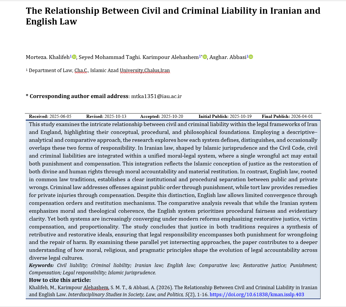 This study examines the intricate relationship between civil and criminal liability within the legal frameworks of Iran and England, highlighting their conceptual, procedural, and philosophical foundations. Employing a descriptive–analytical and comparative approach, the research explores how each system defines, distinguishes, and occasionally overlaps these two forms of responsibility. In Iranian law, shaped by Islamic jurisprudence and the Civil Code, civil and criminal liabilities are integrated within a unified moral-legal system, where a single wrongful act may entail both punishment and compensation. This integration reflects the Islamic conception of justice as the restoration of both divine and human rights through moral accountability and material restitution. In contrast, English law, rooted in common law traditions, establishes a clear institutional and procedural separation between public and private wrongs. Criminal law addresses offenses against public order through punishment, while tort law provides remedies for private injuries through compensation. Despite this distinction, English law allows limited convergence through compensation orders and restitution mechanisms. The comparative analysis reveals that while the Iranian system emphasizes moral and theological coherence, the English system prioritizes procedural fairness and evidentiary clarity. Yet both systems are increasingly converging under modern reforms emphasizing restorative justice, victim compensation, and proportionality. The study concludes that justice in both traditions requires a synthesis of retributive and restorative ideals, ensuring that legal responsibility encompasses both punishment for wrongdoing and the repair of harm. By examining these parallel yet intersecting approaches, the paper contributes to a deeper understanding of how moral, religious, and pragmatic principles shape the evolution of legal accountability across diverse legal cultures.