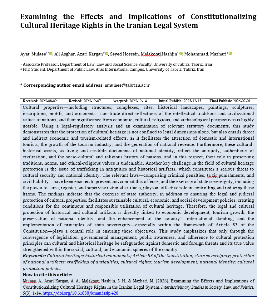 Mulaee, A., Azari Kargan, A. A. ., Malakooti Hashjin, S. H. ., & Mazhari, M. . (2026). Examining the Effects and Implications of Constitutionalizing Cultural Heritage Rights in the Iranian Legal System. Interdisciplinary Studies in Society, Law, and Politics, 1-14. https://journalisslp.com/index.php/isslp/article/view/420